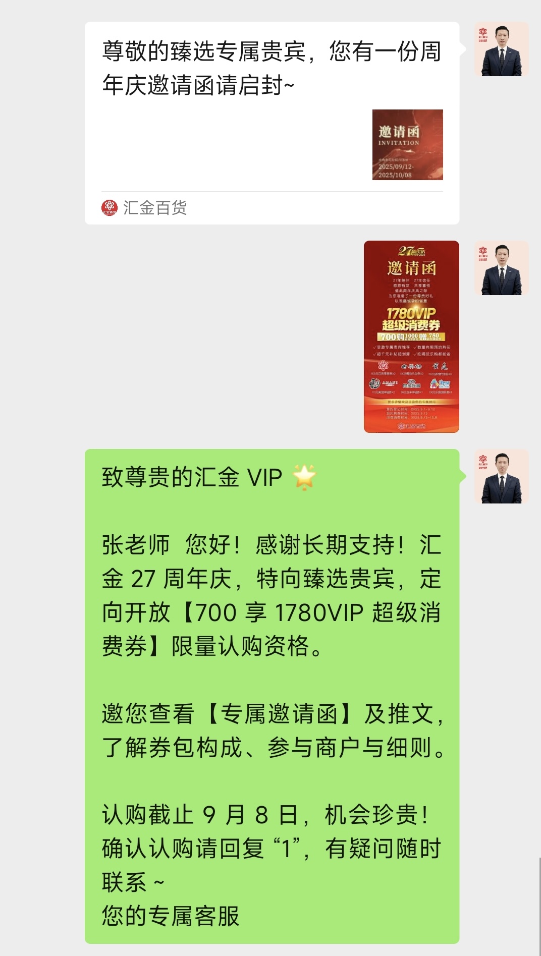 值汇金百货成立27周年之际,为感恩专属贵宾长期以来的支持与陪伴,公司重磅推出“700团1780超级VIP券”尊享回馈礼遇,涵盖百货零售券、餐饮体验券等多项权益,并采用一对一邀约形式,为尊享贵宾建立专属链接渠道。活动中,以贵宾顾问等为代表的公司团队,以专业精进的工作理念为基石,持续打磨服务细节,进一步巩固了公司与忠实客群的深度联结。