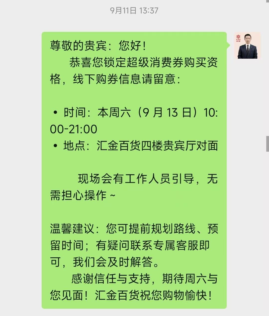为保障已预约贵宾在消费券兑换当日能获得优质、满意的服务体验,公司团队以“细节精进”为核心,提前对全流程接待方案进行规划。线上,贵宾客服提前2天推送预约成功提示,发送包含“兑换时间及地点”“专属客服接待”等信息,并主动提及“恭喜您锁定消费券购买资格”等关键字样,强化会员专属感与获得感。